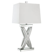 This table lamp features a sculptural X-shaped base accented with shimmering mirrored panels and faceted acrylic crystal inlays. Its bold silhouette and reflective finish create a dramatic presence, while a rectangular white shade provides soft ambient light. Designed to stand out in any glam-inspired space, the lamp fuses artistic form with modern shine—perfect for entryways, bedrooms, or living room consoles seeking a touch of sparkle and geometric sophistication. Key Features: • Table lamp with sculptural X-frame and glamorous mirrored base design • Faceted acrylic crystal inlay adds shimmering visual texture and depth • Rectangular white shade delivers clean lines and diffused light • Mirrored finish reflects surrounding elements to enhance brightness • Striking silhouette works well in glam and contemporary interiors • Ideal for bedside, console, or living room table placement