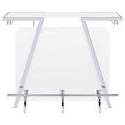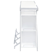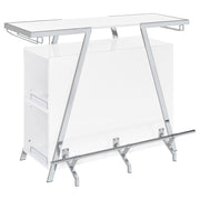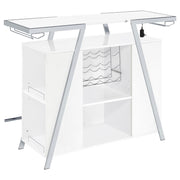 Pull out all the stops to breathe fresh energy and organization into a casual space dedicated to entertainment. Your needs are met with this modular-inspired and contemporary home bar constructed of MDF, paper coating, and veneer, all with a bright white finish. Metal framing is jazzy with a geometric motif, supporting a spacious top shelf ideal for beverage and snack prep. A center compartment features shelving and bottle racks, while the integrated LED strip located on the underside of the table top can change color. This handy bar unit transforms a compact space into a modern home-based venue for fun. Key Features: • Modular-inspired and contemporary home bar constructed of MDF, paper coating, and veneer with bright white finish and metal framing with geometric motif • Spacious top shelf ideal for beverage and snack prep, center compartment with shelving and bottle racks • Integrated LED strip located on underside of table top changes color • Transforms compact space into modern home-based venue for fun • Pulls out all the stops to breathe fresh energy and organization into casual entertainment space
