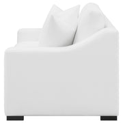 Create your transitional living room interior with this contemporary, white loveseat, upholstered in a white trillium polyester blend fabric throughout its sloped track armrests and top -stitched reversible cushions. A solid wood frame offers long-lasting support and stability as cappuccino finished block legs create a striking contrast. Key Features: • Soft sloped, wide track arms • Relax in trillium filled cushions that create a down-like seating comfort • Reversible seats and backs • Boxed seat and back cushions with top stitching for a tailored look • Wide solid wood legs in cappuccino complement the arm width