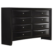 Elevate your bedroom with this elegant eight-drawer dresser, designed for both style and functionality. Finished in a deep black tone, it features chambered drawer fronts that create depth and visual interest, accented by brushed nickel hardware for subtle contrast. Each drawer glides smoothly, offering ample storage for clothing and accessories. Crafted from rubberwood, engineered wood, and okume veneer, this transitional dresser combines durability and refined design to complement a modern or classic bedroom. Key Features: • Eight-drawer dresser with refined transitional silhouette and style • Chambered drawer fronts add sculpted depth and dimensional appeal • Smooth-gliding drawers offer storage for clothing and accessories • Brushed nickel hardware adds a polished metallic accent detail • Crafted from rubberwood, engineered wood, and okume veneer • Ideal for organizing essentials with modern, sleek sophistication