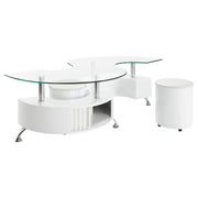 This coffee table features a serpentine shape with a clear tempered glass top and a durable engineered wood base. It includes two stools with padded seats, upholstered in faux leather for added comfort. A sliding door on both sides provides convenient storage space, while chrome accents enhance its sleek, modern design. This piece combines practicality with contemporary style, making it an ideal centerpiece for any living room. Key Features: • Curved serpentine coffee table with clear tempered glass top and chrome accents • Engineered wood construction for lasting durability and sturdy design • Two stools with faux leather upholstery and padded seats for added comfort • Sliding door opens to reveal convenient storage on both sides of the table • Chrome accents contribute to the sleek and modern aesthetic • Cappuccino wood-look finish provides a rich, sophisticated appeal