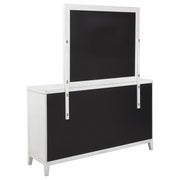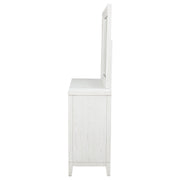 Introduce fresh style and inviting texture with a modern six-drawer dresser and framed mirror. It shows off a distressed white finish over wood grain texture, offering an inviting look and feel in your living room. Each drawer front features layered trim that creates depth and is augmented with a long bar pull in antique brass finish to create contrast. The mirror on top features a squares silhouette with layered trim that matches drawer fronts. Tapered legs complete the look and a tip over restraint is included to add safety in your bedroom. Key Features: • A modern six-drawer dresser with a framed mirror offers a clean-lined silhouette and lots of storage • Distressed white finish highlights wood grain details and bar hardware to create texture and depth • Dresser includes six drawers of equal size, perfect for clothing, accessories and even linens • Tip over restraints are included to add safety and peace of mind to this stylish set