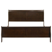 Marry modern and classic design with the rich hues and clean lines from this cappuccino queen bed. Showcasing classic louis Philippe style, the headboard is slightly higher than the footboard. Geometric shapes constructed from wood veneer and select hardwoods make up the frame. With an exposed wood grain, the warm coloring creates a welcoming aura in a bedroom. Thin, delicate legs complete the sophisticated look. Key Features: • Queen bed featuring a modern take on classic Louis Philippe design • Constructed from wood veneer and select hardwoods for durability and longevity • Showcases a rich cappuccino finish with exposed wood grain for a warm, welcoming aesthetic • Headboard is slightly higher than the footboard, adding a geometric touch to the design • Supported by thin, delicate legs for a sophisticated and elegant look