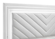 Crisp white high gloss and sculptural textures define this modern bedroom set, blending sleek surfaces with dimensional details. Geometric drawer fronts feature ribbed V-patterns and polished chrome pulls, while all drawers glide smoothly on 45mm metal extension hardware. The headboard stands out with chevron-tufted white faux leather framed by soft white LED trim. Completing the ensemble, a coordinating LED dresser mirror adds ambient glow and polished symmetry to the space. Elevated on chrome legs, this set is a showcase of contemporary form and function. Key Features: • White high gloss bedroom set with sculpted drawer fronts and chevron-tufted LED headboard • LED dresser mirror adds ambient lighting and visual symmetry to the modern design • All drawers include 45mm metal extension glides for smooth and reliable performance • Top drawers are fully lined in black felt to protect valuables and add elevated utility • Chrome U-shaped pulls and tapered acrylic legs provide sleek contrast and support • Crafted from engineered wood and faux leather for durability and shine