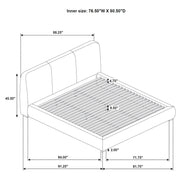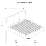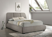 Softly sculpted and thoughtfully tailored, this upholstered platform bed brings a quiet elegance to modern sleep spaces. Its curved silhouette flows from a gently flared headboard to rounded side rails, offering a sense of movement and ease. Three stitched panels add subtle dimension, while the built-in slat system provides durable mattress support without the need for a foundation. Crafted from solid and engineered wood, it balances sculptural form with everyday comfort. Key Features: • Queen platform bed with curved lines and stitched headboard for soft modern design • Taupe fabric upholstery offers warm texture with a clean, neutral visual tone • Sculpted frame flows from the rounded headboard to the low-profile foot rails • Slatted base eliminates the need for a foundation or box spring beneath mattress • Crafted from solid wood, engineered wood, foam, and upholstered in soft fabric • Perfect for modern bedrooms seeking balance between form, texture, and function