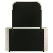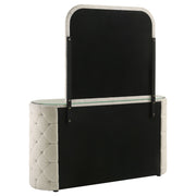 Wrapped in a cloud of boucle and gleaming detail, this dresser and mirror set transforms any bedroom into a personal sanctuary. Diamond tufting along the sides sparkles with embedded crystal accents, while vertical channeling on each drawer adds tailored rhythm and depth. Topped with a sleek mirror framed in matching fabric, the design offers a romantic balance of softness and structure, inviting both elegance and indulgence into everyday routines. Key Features: • Dresser and mirror set features plush boucle upholstery in a soft ivory tone throughout • Six drawers with vertical channeling offer bedroom storage and refined visual texture • Diamond-tufted sides embellished with crystal-style accents elevate the glam appeal • Clear tempered glass top offers a smooth, durable surface that enhances the look • Framed mirror matches the upholstered silhouette for a cohesive bedroom presentation • Crafted from solid rubberwood, engineered wood, boucle fabric, and foam for longevity