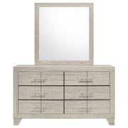 The dresser and mirror set combines sleek, contemporary lines with a touch of rustic charm, making it a standout addition to any bedroom. The dresser, finished in a rustic cream over rough-sawn, white-washed engineered paper veneer, offers six spacious drawers adorned with extra-wide polished nickel handles, adding a modern contrast. The mirror, with a clean-lined frame that complements the dresser, reflects light beautifully to enhance the room's brightness. Built from durable engineered wood with English dovetail joinery and Center metal glides, this set delivers both style and functionality. Key Features: • Dresser in rustic cream with rough-sawn, white-washed engineered paper veneer • Six spacious drawers with English dovetail joinery for added durability • Extra-wide polished nickel handles for a sleek, modern look • Mirror adds depth and light, enhancing the room’s visual appeal • Smooth Center metal drawer glides for easy access • Perfect combination of rustic charm and contemporary design