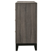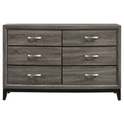 Featuring color blocking, this grey six-drawer dresser is a contemporary take on mid-century modern design. The body showcases a sophisticated, exposed wood grain constructed of oak. Tapered legs in a black finish offer a modern feel, adding visual intrigue with neutral hues. Bright and metallic, light drawer pulls curve off the flat drawer fronts in a half moon shape. Complete a retro motif, or add fun flair to an up-to-date scheme. Key Features: • Transitional style bedroom at a great value • Nickel finished hardware highlights two-tone grey oak finish • Black grooves create a dimensional look • Three-dimensional engineered foil paper veneer in grey oak and black • English dovetail drawer construction • Black finish legs are crafted of solid hardwood
