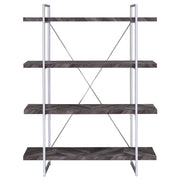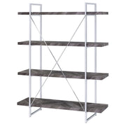 Enhance your storage and display space with this contemporary bookshelf, featuring a rustic grey herringbone finish for a modern organic touch. The sleek chrome metal frame provides durability and style, complemented by an X-shaped back support for stability. Four open shelves extend beyond the frame, creating a bold, geometric aesthetic perfect for showcasing books, décor, or collectibles. Crafted from engineered wood and metal, this shelving unit blends industrial and modern styles seamlessly, making it a stunning addition to living rooms, offices, or bedrooms. Key Features: • Four-tier bookshelf with a bold open-shelf design for a modern look • Rustic grey herringbone finish adds warmth and organic charm • Sleek chrome metal frame with X-back support enhances durability • Extended open shelves provide ample display space for books and décor • Crafted from engineered wood, MDF, and metal for long-lasting use • Ideal for home offices, living rooms, or contemporary spaces