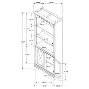 This traditional style bookcase is enhanced with beautiful molded detailing. Two bottom cabinet drawers offer concealed storage for small items. Three open shelves allow you to neatly organize your items. Molded accents on the frame and a curve at the top create an elegant display. This bookcase with doors is finished in burnished oak and supported on bracket style legs. Key Features: • Traditional bookcase with cabinet doors features open and closed storage options • Burnished oak finish highlights molded frame and panel door details on the lower cabinet • Three adjustable open shelves above provide versatile space for books or collectibles • Cabinet includes two doors with antique brass hardware and concealed storage inside • Includes rear wire management cutouts for clean cord routing in office or living space • Made from rubberwood, engineered wood, particle board, and white oak veneer