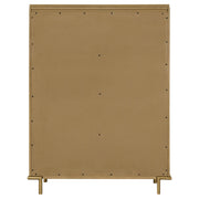 This mid-century modern five-drawer chest combines refined simplicity with thoughtful detail. A warm sand wash finish highlights the wire-brushed texture of the wood, creating natural depth and dimension. The aged brass knobs and slim metal legs add a sophisticated metallic accent, while softly rounded corners lend a smooth, contemporary look. A felt-lined top drawer offers a secure place for delicate items, making this chest a stylish and functional addition to any modern or transitional bedroom._x005F_x000D_ Key Features: • Five-drawer chest in warm sand wash wire-brushed wood finish • Aged brass knobs and legs add modern mid-century sophistication • Felt-lined top drawer protects jewelry and delicate accessories • Rounded corners create a soft, refined silhouette and smooth profile • Crafted from rubberwood, engineered wood, and ash veneer materials • Spacious drawers provide elegant and practical bedroom storage