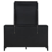 Dress up your bedroom with the impeccable texture and styling of a modern eight-drawer dresser and mirror. Vertical fluting decorates each drawer front and crowns the mirror, offering a refined, artistic touch that elevates without overwhelming. A black finish is rich and deep, perfect to blend with a variety of existing decor and furniture pieces. Its drawer fronts feature vertical fluting details and half-moon handles in a golden finish, delivering the perfect blend of contrast and texture. A framed mirror on top completes the look and offers reflectivity and depth in your bedroom. Key Features: • Chic fluting adds depth and dimension to a modern eight-drawer dresser and mirror • Includes eight drawers of various sizes to accommodate all your clothing and accessory storage needs • Black finish is rich and deep, complementing in many different bedrooms and dressing areas • Half-moon drawer handles are warm and inviting, with a gold finish that adds contrast and dimension • Top drawers include felt lining that offers protection to delicate items, jewelry and accessories • The beveled mirror creates an illusion of depth and dimensionality
