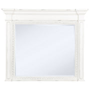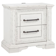 Steeped in elegance and shaped by thoughtful detail, this bedroom set captures the charm of timeless design. Crown moldings and carved accents highlight each piece, softened by a vintage white finish that whispers of age and grace. Hidden features like dual reading lights and jewelry trays offer modern convenience, while traditional construction ensures lasting durability. Crafted from poplar and engineered wood, the set brings classic character to restful spaces. Key Features: • Bedroom set with carved moldings, ornate trim, and traditional architectural elements • Vintage white finish brings a distressed look with soft, antique-inspired appeal • Select pieces include dual LED reading lights and hidden jewelry storage trays • Top drawers are felt-lined and glide smoothly with durable internal construction • Five-sided English dovetail drawers provide strength and full interior access • Crafted from poplar, MDF, and veneer for lasting beauty and classic refinement