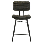 With a hint of ranch inspiration, the design of this five-piece counter height dining set is a brilliant choice for an easy, casual living space. Indulge in a calm vibe with a set anchored by a natural finish sheesham table featuring a spacious rectangular top and tapered, rounded legs. A dark apron with geometric design detail adds an exotic effect. Mid-Century Modern influence adds to four comfortable counter stools with scoop seats and a thick back, both with horizontally channeled leather upholstery. Metal framing features iconic retro slender rounded, splayed legs. Key Features: • Natural finish sheesham table with spacious rectangular top and tapered, rounded legs, dark apron with geometric design detail for an exotic effect • Four comfortable counter stools with scoop seats and thick back, both with horizontally channeled leather upholstery, metal framing with iconic retro slender rounded, splayed legs • Ranch-inspired design perfect for an easy, casual living space • Mid-Century Modern influence adds to the overall look • Create a calm vibe with this five-piece counter height dining set