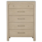 Gracefully composed with rounded edges and sculptural form, this five-drawer chest evokes a quiet sophistication. Its tall silhouette offers a sense of order, while sculpted corners and subtle detailing bring soft elegance to the bedroom. A felt-lined top drawer and hidden compartment add thoughtful layers of function. Crafted with care and presence, it offers both beauty and intrigue in equal measure. Key Features: • Five-drawer chest with sculpted corners and softened lines for elegant bedroom storage • Weathered mango finish enhances natural grain with a relaxed, organic texture • Felt-lined top drawer offers gentle protection for jewelry, watches, or accessories • Secret nested drawer in second drawer from top provides discreet storage • Heavy duty drawer glides ensure smooth, lasting drawer operation • Crafted from mahogany, engineered wood, and mango veneer for strength and style