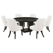 Gather in grounded elegance with this dining set, where sculptural form and graceful texture meet. A bold round pedestal table anchors the space in a burnished black finish, its open base and soft curves inviting conversation and connection. Surrounding it, barrel-back arm chairs cradle each guest in cream fabric and cushioned ease. From candlelit evenings to morning rituals, this set is a quiet celebration of balance, beauty, and belonging. Key Features: • Dining set features a burnished black pedestal table with curved edges and open base • Cream upholstered arm chairs offer barrel-back support and sculptural comfort • Soft flared frames and cushioned seats create an inviting, elevated dining experience • Round table silhouette encourages connection in intimate and open spaces alike • Crafted from rubberwood, ash veneer, engineered wood, and textured fabric • Modern organic styling blends strength, flow, and warmth in a unified setting