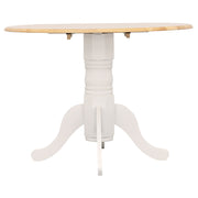 Bring cozy charm to your dining area with this round drop leaf dining table. Designed with a smooth tabletop and sturdy pedestal base, it combines traditional craftsmanship with functional versatility. The drop-leaf design allows you to expand or reduce the surface space as needed, perfect for compact dining areas or breakfast nooks. Elegant curved legs add a touch of sophistication, while the contrasting natural wood top and white base create a bright, welcoming two-tone look for everyday gatherings. Key Features: • Dining table features a classic round drop-leaf top for versatile seating • Crafted from solid rubberwood for dependable everyday durability • Smooth two-tone finish with a natural top and crisp white base • Elegant turned pedestal design adds timeless farmhouse appeal • Four curved legs provide balanced support and visual refinement • Perfect size for small dining spaces, kitchens, or breakfast nooks