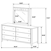 Classic sophistication meets everyday function in this dresser and mirror set. The six-drawer dresser showcases a rich cappuccino finish with brushed silver hardware and wide, smooth-gliding drawers for ample storage. Above, a matching rectangular mirror adds light and space with its leatherette-padded frame detail. Together, they create a cohesive centerpiece for your bedroom, blending traditional elegance with modern comfort and built from durable rubberwood and veneer construction. Key Features: • Six-drawer dresser paired with a matching padded frame mirror • Cappuccino finish enhances warmth and transitional character • Brushed silver hardware provides contrast and modern appeal • Spacious drawers offer organized storage for bedroom essentials • Mirror adds brightness and depth with its generous size • Crafted from rubberwood, veneer, and engineered wood for strength