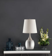 This pair of modern table lamps blends a graceful teardrop base with a brushed silver finish and classic empire shade. Designed for balance and symmetry, each lamp features an urn-shaped silhouette with a gently tapered neck, creating soft visual flow. The clean white shades diffuse light beautifully, making this matching set ideal for flanking beds, sofas, or consoles in any modern or transitional space. Key Features: • Table lamp set includes two matching lamps with gently curved urn-style bases • Silver finish offers a sleek, brushed metallic tone with subtle modern shine • Empire shade softens light with a clean, classic silhouette • Tapered necks lend graceful contrast to the rounded teardrop bases • Crafted from sturdy materials for durability and long-term daily use • Ideal for bedside tables, console tables, or entryway accent lighting