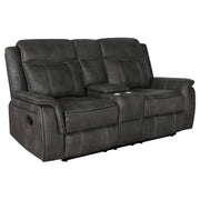 This reclining loveseat combines cozy comfort with practical convenience. Upholstered in performance-grade microfiber, it features padded arms, a tufted back, and pocket coil cushions with cool gel memory foam for supportive, temperature-regulated seating. Manual recline mechanisms on both sides allow effortless relaxation, while a center console adds functionality with lift-top storage and dual stainless steel cup holders. With a wall-hugger design that maximizes floor space, this loveseat is both stylish and functional for the living room. Key Features: • Reclining loveseat in charcoal microfiber with padded arms and tufted back • Manual reclining seats allow smooth operation and effortless relaxation • Wall-hugger mechanism keeps loveseat close to wall while maximizing space • Pocket coil cushions with cool gel memory foam enhance seating comfort • Center console with lift-top storage and dual stainless steel cup holders • Performance-grade microfiber upholstery ensures softness and durability