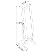 This dual-purpose jewelry Cheval mirror adds practicality to style. It's constructed five feet high to give you plenty of area to check your look from head to toe. Opening up to a green felt-lined storage with enough shelves and a small drawer, it also serves as a jewelry armoire. A four-inch deep jewelry box is built in to hold valuable accessories like watches and bracelets. The mirror is finished in white and tilts for convenience. Key Features: • Transitional jewelry cheval mirror in white finish • Dual purpose jewelry armoire and mirror • Ample amount of shelves, hooks, ring holders, and two drawers keep everything organized • Dark green felt-lined interior • 4" deep jewelry box