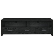 Enhance your modern living space with this 61-inch TV stand in a rich black oak finish. Designed to accommodate TVs up to 70 inches, it features a sleek profile accented by brushed silver hardware for a contemporary contrast. Two open compartments provide easy access for media components, while three spacious drawers store accessories, remotes, and gaming essentials. Crafted from engineered wood with a black tempered glass top, this stylish TV stand blends function and elegance with lasting durability. Key Features: • 61-inch TV stand accommodates TVs up to 70 inches • Black oak finish with silver hardware for modern appeal • Three drawers provide concealed storage for accessories • Two open shelves hold media devices and entertainment gear • Tempered black glass top adds sleek visual sophistication • Crafted from engineered wood and laminate for durability
