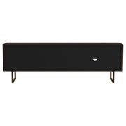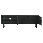 A dramatic charcoal black finish coats wood products construction, adding a bold look to this casual yet elegant TV stand. Gather entertainment-related gear and organize it in this tasteful stand built of mango wood with a rustic aesthetic. Set atop black finish iron bracket legs, it creates a sturdy venue for a large flat-screen TV. Components find room in two side compartments, as incidentals and media may be stashed on a fixed shelf behind two side doors with ornate iron hardware. Avoid clutter with a pre-cut wire management hole. Key Features: • Elevate your entertainment area with a TV stand featuring a dramatic charcoal black finish, infusing a bold and elegant touch • Crafted from wood products with a mango wood rustic aesthetic, this stand offers a tasteful solution for organizing your entertainment-related gear • Sturdy iron bracket legs in a matching black finish provide a stable base for your large flat-screen TV • Keep your components organized in two side compartments, while incidentals and media items can be stored behind two side doors adorned with ornate iron hardware • Say goodbye to cable clutter with a convenient pre-cut wire management hole, maintaining a clean and tidy look in your living space