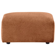 Rounded edges and plush volume define this bold ottoman, designed to pair effortlessly with the collection’s sculptural seating. Wrapped in ultra-soft chenille and padded with dense foam, it serves as a footrest, extra seat, or soft-surface table. Built from rubberwood and engineered wood, this multipurpose piece blends lasting durability with modern comfort. A cozy accent for lounges, living rooms, or open-concept spaces. Key Features: • Ottoman features a rounded silhouette with bold curves and clean, soft edges • Chenille fabric in burnt orange offers rich texture and a warm, cozy look • Padded top doubles as a footrest, casual seat, or soft surface for a tray • Plush foam interior provides inviting comfort and resilient support • Crafted with rubberwood, plywood, and engineered wood for strength • Pairs perfectly with accent chair or loveseat to complete a sculptural lounge set
